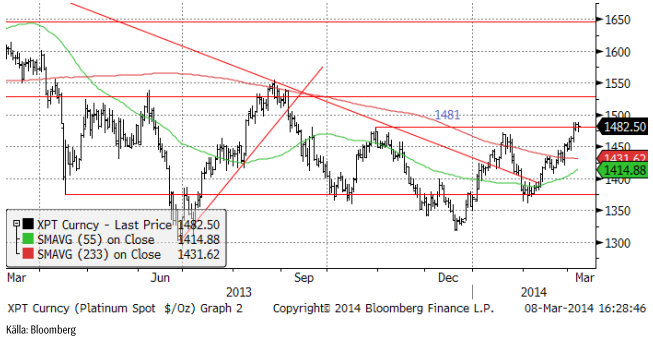 Platina har sedan det förra veckobrevet stigit med 50 dollar till 1482.50 dollar per uns. Det är en tekniskt intressant motståndsnivå, i chartet markerad med ”1481”. Egentligen är nivån alltså bruten på uppsidan redan, men som vi ser har marknaden under de tre senaste dagarna inte lyckats gå högre, av någon anledning.
