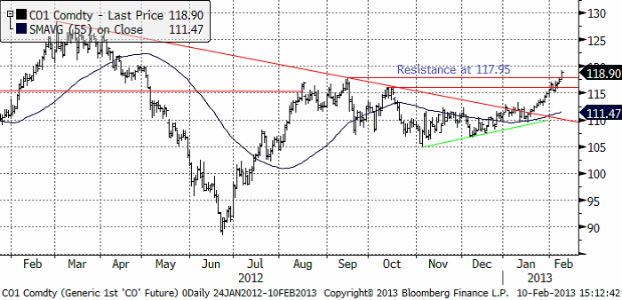 Råoljepriset har brutit alla närliggande tekniska motstånd och har fritt upp till 125 dollar. Vi fortsätter att rekommendera köp av olja. Bäst är om man kan komma in lite billigare efter en rekyl.