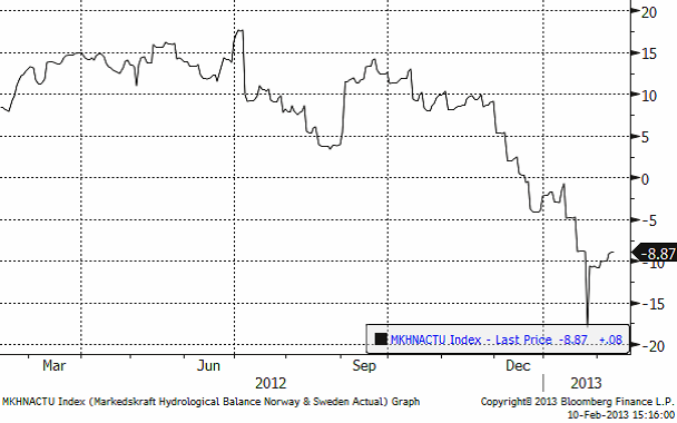 Den hydrologiska balansen för NordPools börsområde gick i veckan från ett underskott på 10 TWh till ett underskott på -8.87 TWh. Det är ”bullish”.