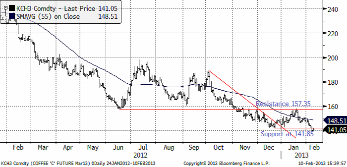 Kaffepriset föll oväntat i veckan som och studsade på 140 cent per pund. ”Stödet” på 141.85 fungerar nu som motstånd. Vi tror trots allt att marknaden befinner sig i en vändningsfas efter två års kraftigt prisfall. Den jämna prisnivån 140 cent fungerar också som ett stöd i sig. Det finns säkerligen en hel del köpordrar lagda på den nivån. Men vi skulle vilja se priset stiga över stödnivån på 141.85 cent för att förtroendet för att vändningsfasen ska ske på den här nivån ska stärkas.