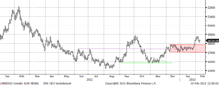 Priserna föll 2-3 % för att under torsdagen och fredagen återhämta, och således stänga oförändrade. Undantaget är favoriten zink som trots en rejäl rekyl stänger upp 1,6 %. Marknaden fick en extra impuls av fredagens handelssiffror från Kina som visade en 25 % -ig ökning av exporten i januari. Importsiffrorna var också starka med en ökning med 28 %, det senare och beror säkert på att ”bokningar” gjorts före det kinesiska nyårsfirandet nästa vecka. Med många kinesiska aktörer på ledighet nästa vecka förväntas volymerna vara begränsade, vilket i sig kan skapa lite oförutsedda prisrörelser. Men troligast är avvaktande handel.