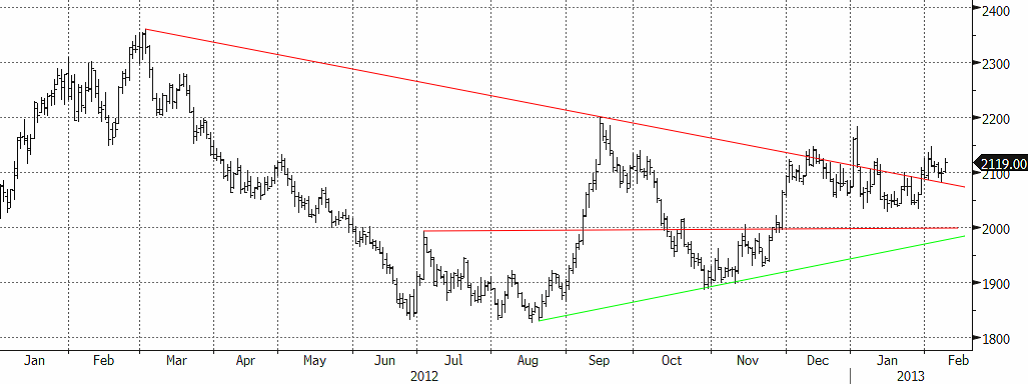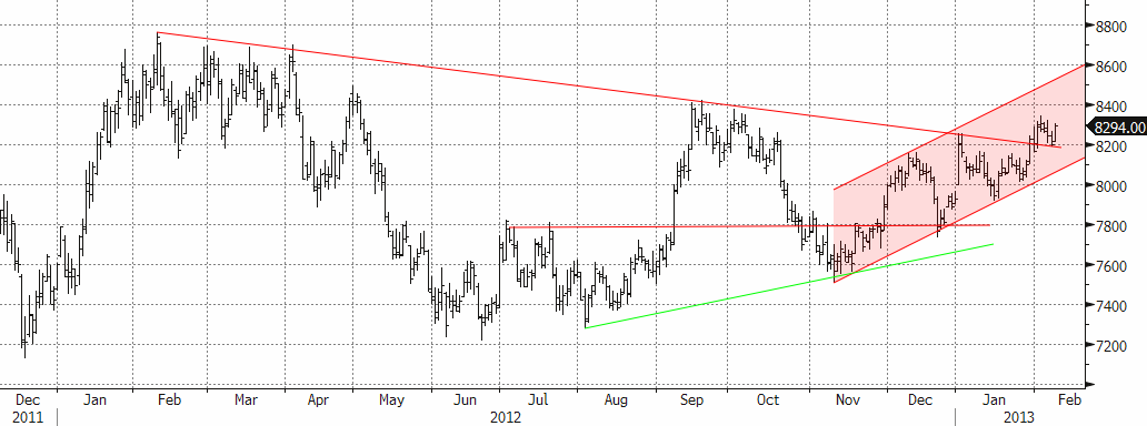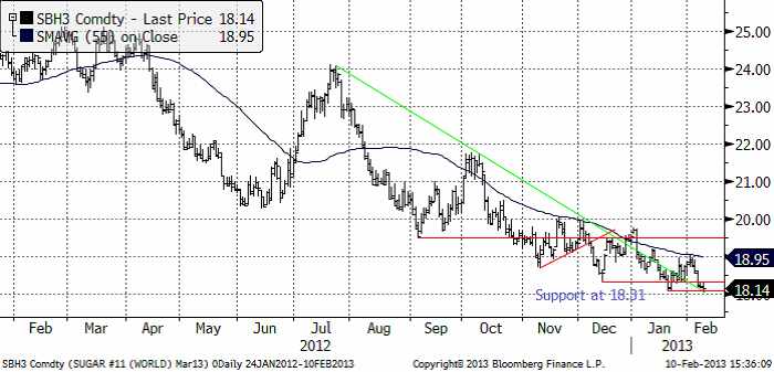 Sockerpriset (mars 2013) föll kraftigt i början av veckan. Den förra botten från januari på 18 cent, fungerade nu som ett stöd. I fredags stängde mars-kontraktet på 18.14 cent per pund. Det är strax över stödet på 18 cent. Trenden är nedåtriktad och kraften av den rörelsen ”bör” enligt beprövad erfarenhet få stödet att brytas, kanske redan i veckan.