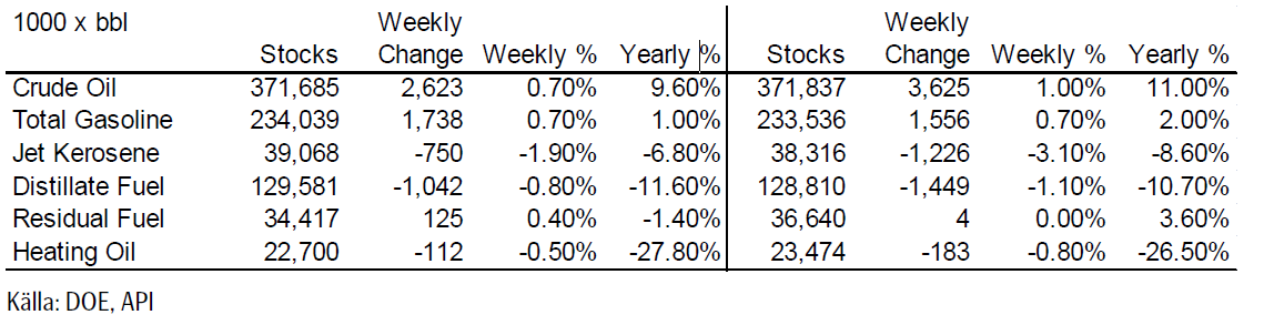 Lagren för destillat och heating oil, som redan låg under förra årets nivå, forsätter att minska. Detta är stödjande.