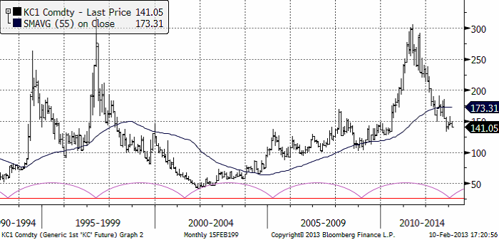 I diagrammet nedan ser vi lite längre prishistorik på kaffe. I den nedre delen av diagrammet ser vi en priscykel om lite drygt fyra år. Den verkar finnas där (statistiskt säkerställd). Kanske har den sitt ursprung i vartannatårs-karaktären av skördens storlek från arabica-busken, i kombination med hur lantbrukarna reagerar på den och prisförändringarna. Enligt den här pris-cykeln, är priset nära en cyklisk botten nu.