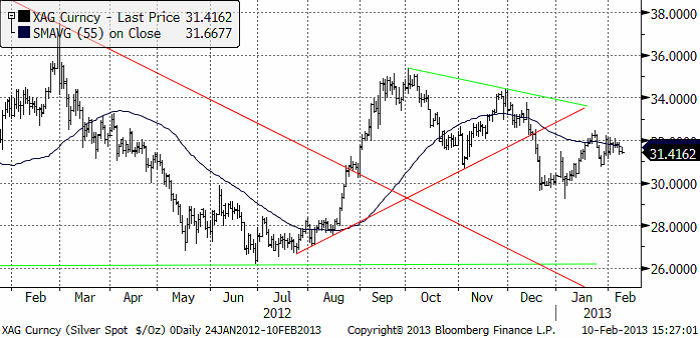 Vi noterar också att guldmarknaden forsätter att bilda ”trianglar” i sin pendling uppåt och nedåt. Det innebär att ett brott uppåt omedelbart genererar en köpsignal. Skulle priset med andra ord gå upp till över 1700 dollar, har vi en köpsignal. Just nu är dock den senaste signalen en säljsignal. Med reservation för att det kan bli en snabb rekommendationsförändring, håller vi fortfarande fast vid den säljrekommendation vi haft sedan december.