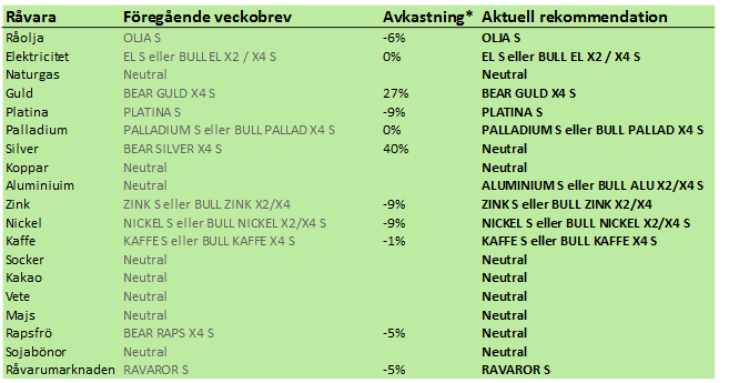 *) Avkastningen avser 1:1 råvarucertifikat där de ingår i rekommendationen. I den aktuella tabellen ovan har jag tagit prisförändringen den senaste månaden, eftersom den finns lätt tillgänglig och det är nästan en månad sedan det förra veckobrevet publicerades.