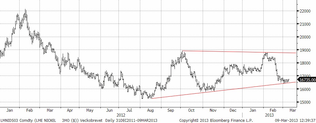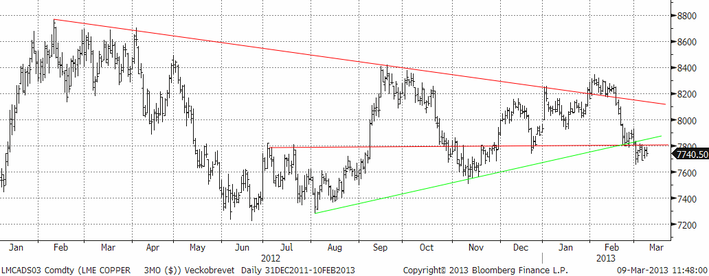 Den tekniska bilden ger stöd till vår neutrala position. Vi är positiva till basmetaller på sikt men avvaktar bättre köptillfällen alternativt väljer någon annan basmetall. Den stora triangelformationen börjar spela ut sin roll. Stödnivåer noteras vid 7600 och 7400. Nivån 7800 fungerar nu som motstånd.