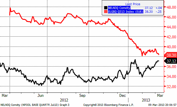 Nedanför ser vi prisutvecklingen för det tredje kvartalets tyska elpriskontrakt (röd) och Nord Pools tredje kvartalskontrakt (svart). Det tyska priset har rört slutat falla för två månader sedan.