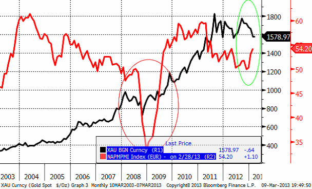 Vi tycker oss känna igen dagens svaga guldmarknad och starka konjunktursignaler från flera gånger förr, senast från bottenvändningen 2008/09.