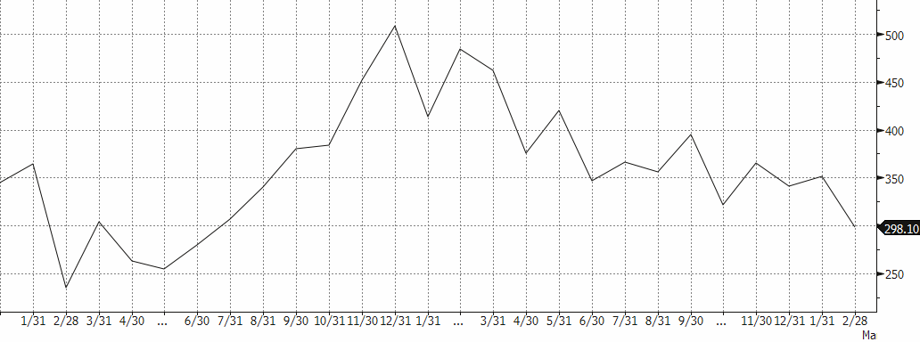 Vi är dock fortsatt försiktigt inställda till kopparn. Vi följer Kinas importsiffror som en indikation på efterfrågan. Siffran i februari kom in på 298 tton (se diagram) jämfört med 350 tton i januari och 485 tton för ett år sedan. Februarisiffran bör dock tas med en nypa salt då ledigheterna i Kina påverkar rapporteringen. Icke desto mindre är trenden ganska tydlig.