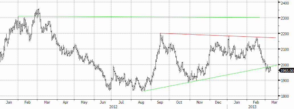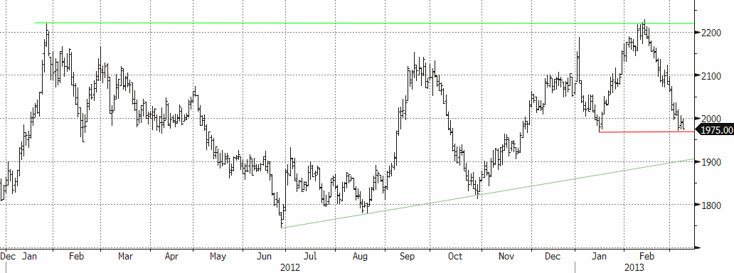 Priset ligger nu på stödnivån $1975. Tekniskt sett är alternativet att vänta (med risk för att missa uppgången) för att se om priset kan ta sig ner till stödnivån från trendlinjen kring $1900.