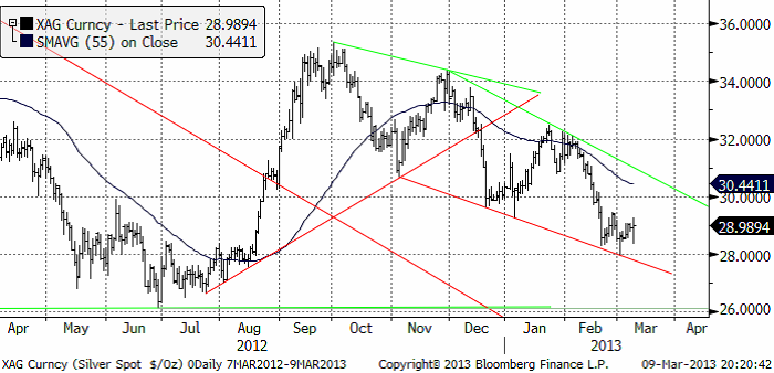 Nedan ser vi kursdiagrammet för silver i dollar per troy ounce. Priset ligger nära botten i en trendkanal nedåt. Nivåmässigt borde det finnas stöd på den här nivån vid 28 cent. En rekyl uppåt kan komma. Den som vill ta en kortsiktig trade på den, kan göra det. Men läget är i vart fall inte entydigt negativt i det korta perspektivet, så vi väljer att gå ur vår köpta position i BEAR SILVER X2/X4 S.