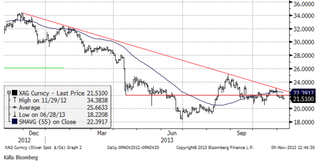 Nedan ser vi kursdiagrammet för silver i dollar per troy ounce. Vi noterar att den fallande trendlinjen / motståndet från toppen för ett år sedan, inte har brutits och att marknaden inte lyckades bryta igenom den. När sådana test misslyckas brukar det ofta leda till besvikelse, med kursfall som följd.