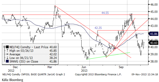 Elpriset, som föll när det blöta väder vi nu upplever började dyka upp i prognoserna, fann stöd på 39 euro per MWh och handlades upp till 41 euro. I torsdags fick vinsthemtagningar priset på fall, men handeln i fredags var stark. Marknaden kommer antagligen att testa 41 euro igen. Ovanför finns nästa motstånd vid 42.35 euro.