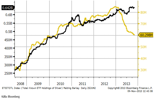 I diagrammet nedan ser vi antalet uns som innehas av börshandlade fonder. Den gula kurvan avser guld och den svarta silver. Vi ser att investerare fortsätter att likvidera sina likvida börshandlade fonder på guld. I och för sig är det anmärkningsvärt att priset inte faller, trots att säljtrycket från investerare är så starkt. I klassisk litteratur om marknadsanalys, finns resonemang om vad som händer efter ett stort kursfall. Det sägs att ägandet flyttas från ”svaga händer” till ”starka” i en process som kallas för ”konsolidering”. Det är möjligt att det är detta som håller på att ske nu. Många som köpt börshandlade fonder på guld har kanske gjort det utan särskilt mycket annan analys än att priset verkar gå upp (dvs tidigare) och nu säljer de för att priset verkar gå ner.