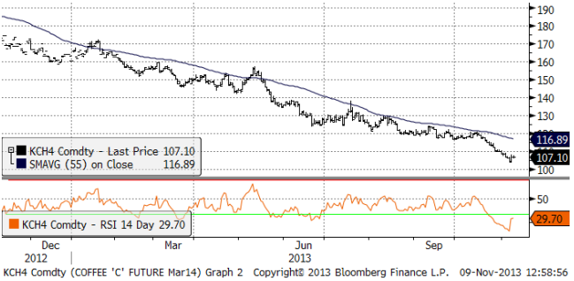 Kaffepriset föll ner mot 100 cent per pund i veckan, men fick stöd där. Nivån 100% har de senaste 40 åren varit en stödnivå. När priset kommit uppifrån har trenden i regel vänt upp. Räkna gärna själv hur många gånger det har hänt!