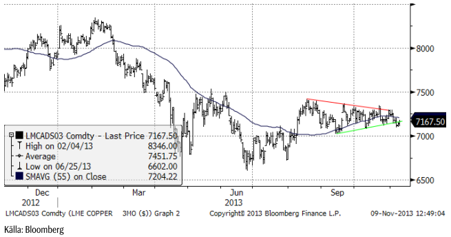 Nedanför ser vi kursutvecklingen på dollar mot kronor. Europeiska valutor, inklusive den svenska kronan, föll direkt efter ECB:s i och för sig väntade sänkning av styrräntan till 0.25%. Dollarn styrka fick sedan ytterligare skjuts när arbetsmarknadsstatistiken i USA visade att över 200,000 människor fått nytt jobb under oktober månad. Detta trots budgetbråket och stängningen av den amerikanska federala staten under månaden. En starkare dollar betyder automatiskt lägre noteringar på råvaror, när de uttrycks i dollar.