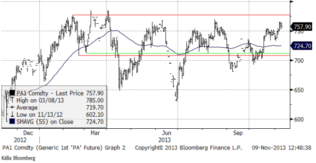 Detsamma gäller marknaden för palladium, som utvecklats mycket starkt den senaste tiden. Priset är uppe på nivåer i toppen på på det prisintervall som varit rådande det senaste året. Den kortsiktiga trenden är uppåtriktad, men motstånden kan få den trenden att ta slut.