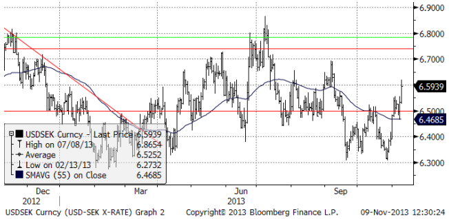 Veckans huvudtema har varit dollarns styrka å ena sidan och eurons och kronans å den andra. De amerikanska siffrorna fortsätter att överraska på uppsidan, i veckan både med BNP och NFP. Detta ökar i sin tur en eventuell start av nedtrappning av den monetära stimulansen i USA redan i december eller åtminstone tidigare än diskonterats. ECB sänkte som väntat (men uppenbarligen som en överraskning för några) styrräntan till 0.25%. Detta gav också en försvagning av europeiska valutor och en förstärkning av dollarn i veckan. ECB gjorde detta eftersom inflationen så tydligt är på väg nedåt och för att arbetslösheten i EU är så hög och ”hållbar”.
