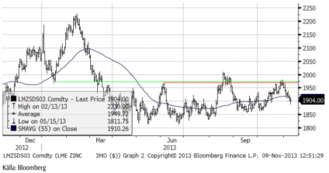 Så nu är vi i den något förvirrande situationen, där starka siffror i USA är negativt för metallpriserna, såsom uttryckta i dollar. Som vi har sagt tidigare att vi tror att detta är en kortsiktig effekt och att tillväxtutsikterna kommer att ta över, förr eller senare . Ännu viktigare för metallefterfrågan är naturligtvis Kina, varifrån vi såg viss uppmuntrande handelsstatistik. Viktigast var högre export, vilket är en indikation på bättre efterfrågan utanför Kina. I helgen började kommunistpartiet fyra dagars plenum, vilket förväntas ge information om hur ledarskapet kommer att stödja konjunkturen.