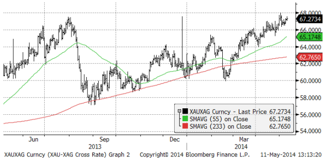 Nedan ser vi ett diagram över priset på guld uttryckt i silver. Det går alltså över 67 finuns silver på varje fin-uns av guld (förra veckan 66 uns silver). Som vi ser är det en hög nivå, dvs silver är billigt i förhållande till guld.