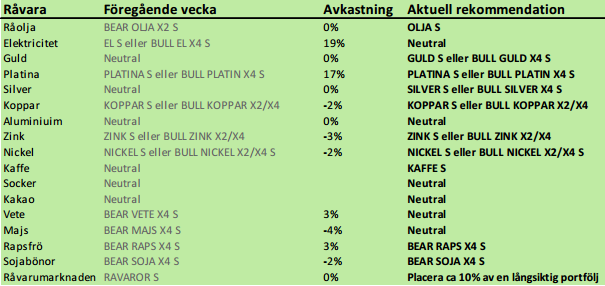 Råvaruindex var oförändrat i veckan som gick. Till vinnarna hörde platina, el, majs och kaffe. De som föll mest var utsläppsrätter för CO2 och kol (som båda används för att producera el) och zink. På grund av diskrepansen mellan elpris och kostnaden för att producera el, går vi över till neutral rekommendation på el. I fredags kväll publicerade det amerikanska jordbruksdepartementet (USDA) också sina månatliga estimat på jordbruksprodukter, samt höstsådd av vete och lager per 1 december. Efter att ha analyserat den statistiken ändrar vi också säljrekommendationerna för majs och vete till neutral rekommendation. Socker och i synnerhet kaffe ser ut att bilda en botten efter en lång tid av fallande pristrend. För kaffe går vi över till en köprekommendation av KAFFE S, men avvaktar med socker i neutralt läge.