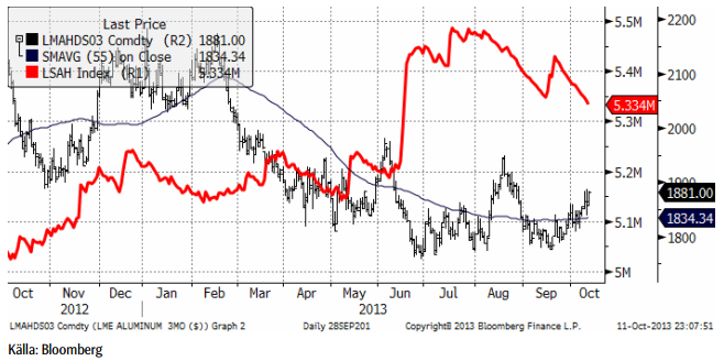 Folk gick till LME-veckan med en baissig inställning till aluminium, men åkte nog hem något mindre negativa. I mitten av förra veckan visade en del analytiker ett mindre överskott (produktion > konsumtion) än tidigare och Alcoa publicerade sin kvartalsrapport i onsdags – som skrev om ett kommande underskott! Även om folk anser detta som tämligen osannolikt, räckte bränslet för en prisuppgång. Efter uppgången mot 1890 i fredags börjar marknaden se lite dyr ut istället. Det finns trots allt ett överskott och Kina investerar just nu i ny kapacitet istället för att dra ner. Alcoa behöll sin prognos på en stadig efterfrågeökning om 7% per år, vilket är i linje med, men något högt, jämfört med de flesta analytikers prognoser. Så länge utbudet ökar mindre än efterfrågan kommer det att ske en långsam, men stadig förbättring av den grundläggande balansen, men fortfarande finns det stora lager som måste betas av.