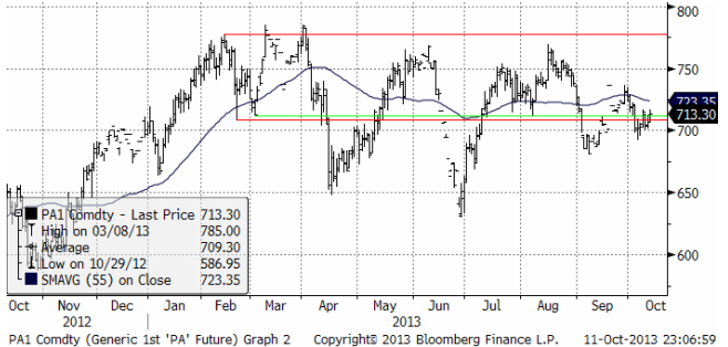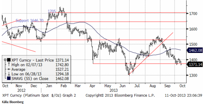 Platinapriset stängde i fredags på ett teniskt stöd. Det har varit en solid nedgång sedan månadsskiftet augusti-september och det marknaden är i behov av en uppgång, men om guldmarknaden faller igenom sitt stöd, bör även platina fall ner mot 1300 dollar. Priset står just nu och väger. Jag tror mer på en nedgång. Om priset går över 1400 dollar har vi däremot en köpsignal, enligt teknisk analys.