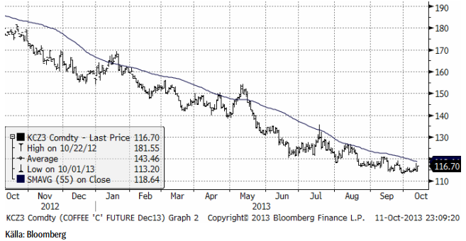 Kaffepriset noterade nya, fräscha, bottennoteringar i veckan som gick. Trenden är nedåtriktad. Vi väntar på en uppgång, men fortsätter att vänta av timing-skäl. På lite längre sikt borde kaffe vara en given vinnare.