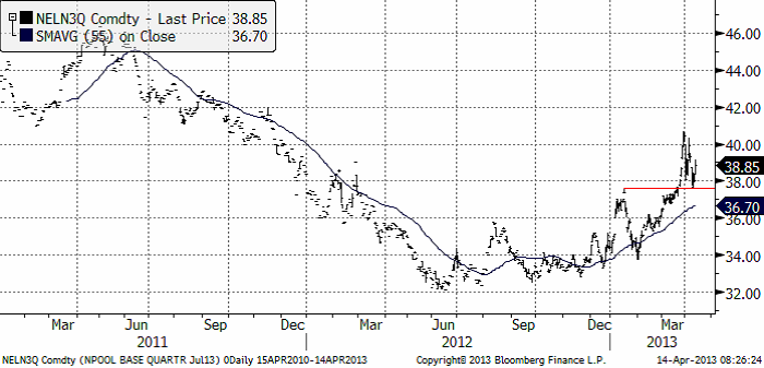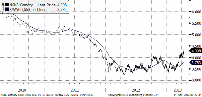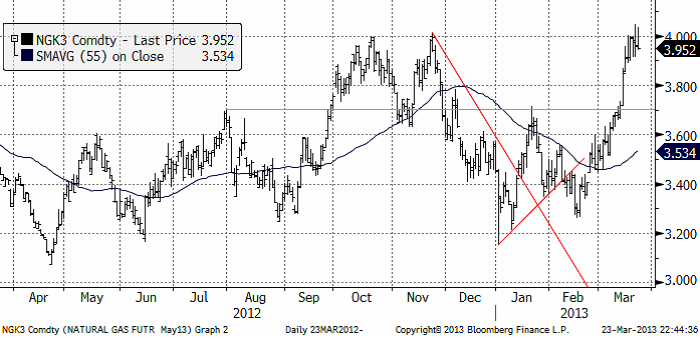 Det är kallt även i USA och naturgaspriset har påverkats av detta även där. Naturgasterminen på NYMEX (maj 2013) har handlats upp ordentligt och testar nu 4 dollar, där priset vänt ner två gånger tidigare. Vi fortsätter att hålla oss neutralt till naturgasen – men skulle ett brott ske av 4 dollar – är det en tydlig köpsignal. Vi ser kursdiagrammet nedan: