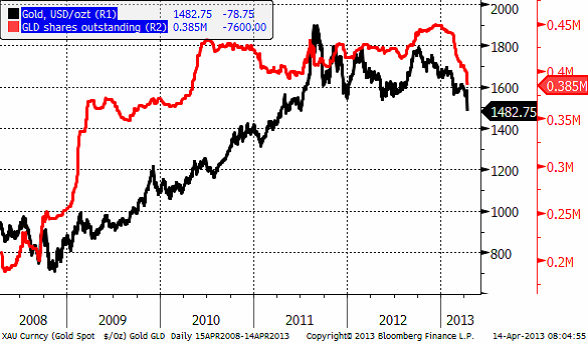 Minskningen av antalet utestående depåbevis av GLD är den starkaste de senaste fem åren. Till viss del beror detta på att placerare konverterat sina depåbevis till tackor, en säkrare form om man liksom italienare är orolig för en skatt på finansiellt sparande som hände på 90-talet i Italien och nu sker på Cypern. Det hände även i Sverige, när staten tog ut ”överskottsmedel” (samma ord som EU Kommissionen använder för Cyperns guldreserv) från AP-fonderna för några år sedan. En stor del av minskningen av GLD-depåbevis är sannolikt också rena försäljningar, som alltså lett till försäljning av guld på London Bullion Market.