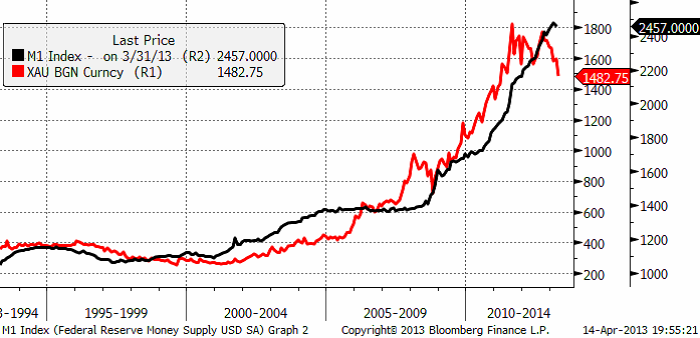 Guld är trots allt en värdebevarare i inflationsskyddad mening och eftersom penningmängden ökar så kraftigt i alla stora och sparkapitalsfulla ekonomier, borde guld vara en attraktiv tillgång. Traditionell monetarism säger att om man inte förändrar antalet varor, men ökar mängden pengar, måste priset i dessa pengar stiga på varorna. Nedan ser vi M1 i USA. M1 är den smalaste måttet på penningmängd och mäter bara mynt, sedlar och bankinlåning som har betalningsmöjligheter kopplade till sig (checkar eller kort).