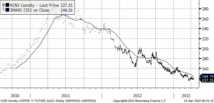 Kaffepriset (maj 2013) fortsatte ner i veckan som gick och fortsatte därmed den fallande trenden. Vi tror att en trendvändning är nära förestående, men det är ingen idé att köpa KAFFE S innan trenden har vänt.