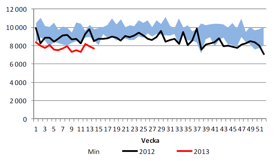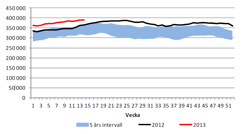 Nedan ser vi amerikanska råoljelager enligt DOE i tusen fat. Den svarta kurvan är 2012 års lagernivåer vecka för vecka och den lilla röda linjen är 2013 års nivå. Vi ser att lagernivåerna fortsätter att vara högre än de varit sedan 2007 för den här tiden på året. Säsongsmässigt är det tid för lagerökningar och de senaste veckornas lagerökning har varit lite mindre än den årets tidigare trend skulle ha medfört. Detta borde i sig vara ”bullish”.