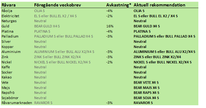 *) Avkastningen avser 1:1 råvarucertifikat där de ingår i rekommendationen. I den aktuella tabellen ovan har jag tagit prisförändringen den senaste veckan sedan det förra veckobrevet publicerades.