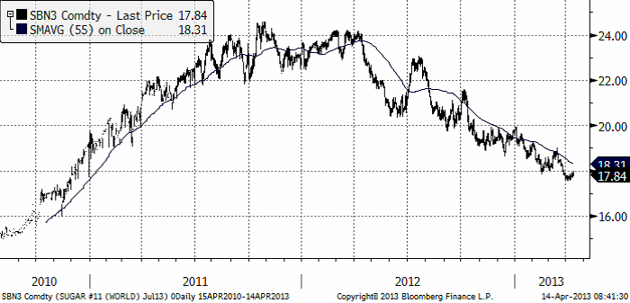 Sockerpriset (september 2013) föll i slutet av mars under 18 cent per pund. De senaste dagarna har priset rekylerat upp mot det motståndet, men inte orkat igenom. Trenden är alltjämt nedåtriktad. Vi fortsätter med neutral rekommendation.