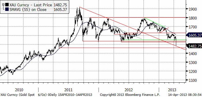 Fredagen slutade i mega-baisse för ädelmetaller. Att fallet blev så kraftigt beror till stor del på att ett avgörande tekniskt stöd bröts. Man kunde nästan se hur säljare tryckte på för att pressa ner priset under stödet och hur fallet för några ögonblick hejdades en bit under när dessa säljare täckte en del av den korta positionen. Skådespelet gick fort och priset tog stora kliv nedåt på minutbasis.