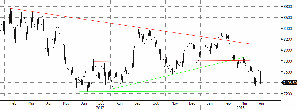 Den tekniska bilden ger stöd till vår neutrala position. Vi är positiva till basmetaller på sikt men avvaktar bättre köptillfällen alternativt väljer någon annan basmetall. Priset kommer nu ner i ett intressant stödområde mellan $7200 och $7300.