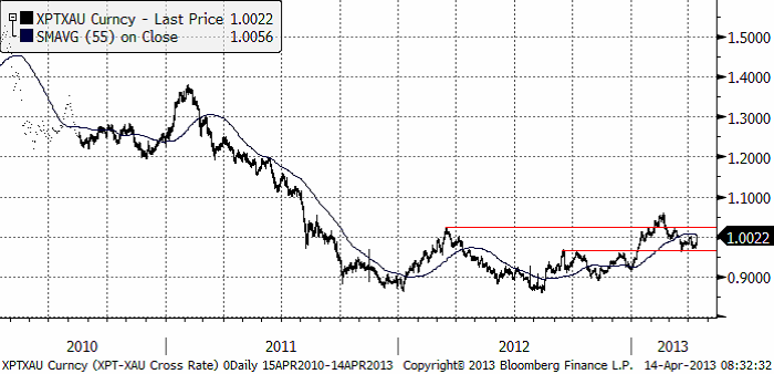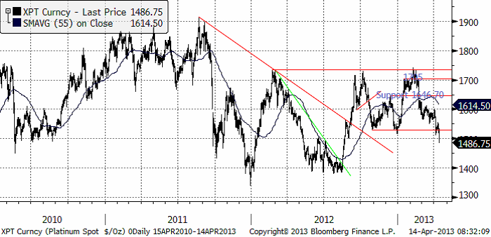 Platinapriset ligger strax över stödet på 1550 dollar, som testades – och höll – i veckan som gick. Om 1525 – 1550 byts på nedsidan är nästa stöd 1400.