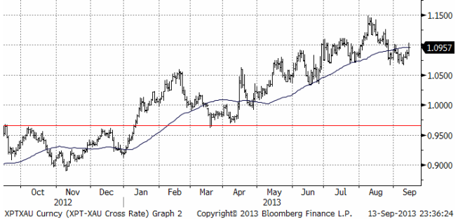Nedan ser i kvoten mellan platina och guld. I slutet av förra veckan steg platina i förhållande till guld, men vi ser detta som en kortsiktig ”blip” och tror att platina kan falla tillbaka.