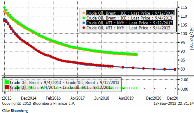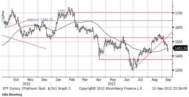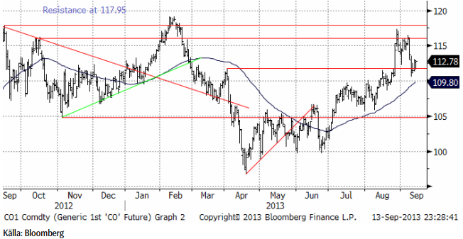 Oljepriset föll tillbaka när det gick upp för alla – även de som inte läst det här veckobrevet – att USA inte skulle eskalera konflikten med Syrien. Som vi skrev för redan två veckor sedan var det uppenbart att USA:s president inte skulle fullfölja sitt hot. Syrienkonflikten skulle kunna ha påverkat producerande länder, så att oljepriset påverkats, men det finns även andra faktorer som faktiskt har en påverkan på oljepriset och som fått verka i det tysta. Libyens produktion har haft problem och efterfrågan har fått skjuts av den ekonomiska återhämtningen som sker i hela världen. Oljepriset befinner sig i en positiv trend rent tekniskt. Priset har gott stöd vid 110 dollar per fat, men motstånd vid 118 dollar ungefär. Fortfarande handlas oljepriset inom det prisintervall som varit rådande sedan tre år tillbaka.