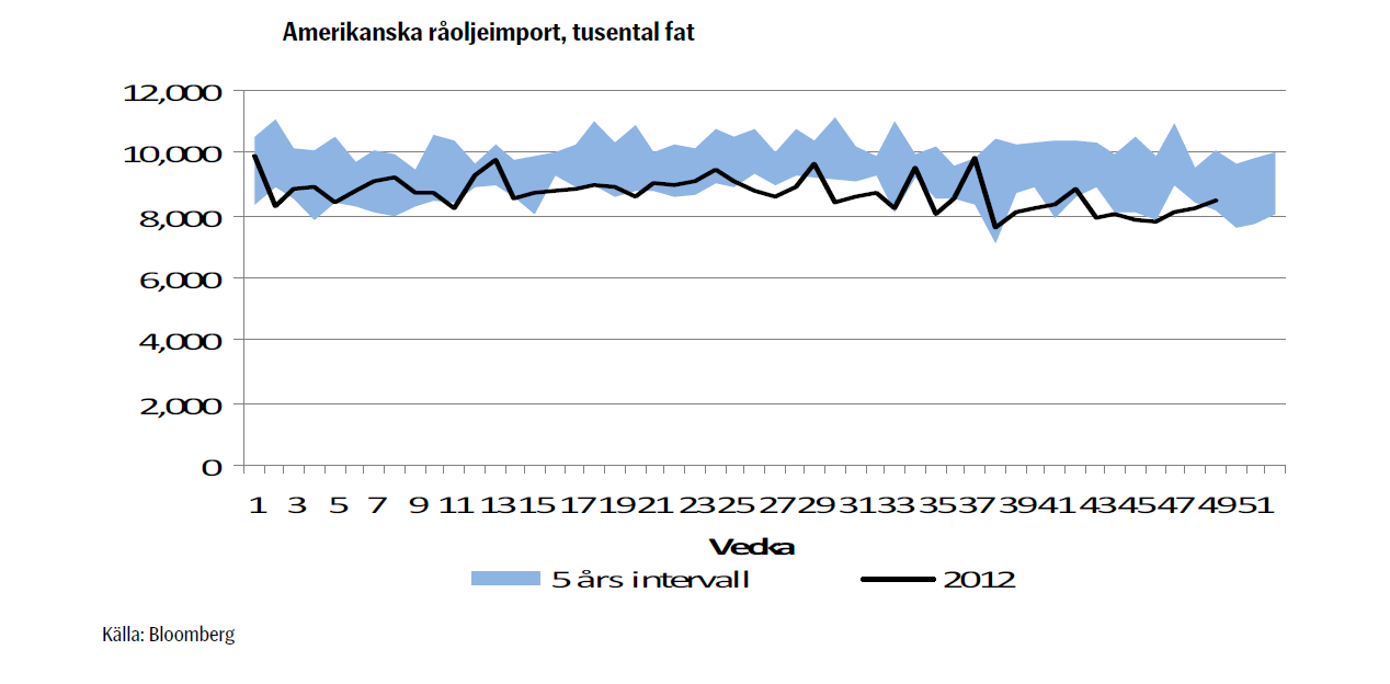 OPEC höll möte den 12 december. Inga stora överraskningar levererades. Produktionsmålet är fortsatt 30 mfat per dag. Istället för att kalla kvoten ”tak” benämndes det nu istället nivå, vilket indikerar lite mildare retorik. Kanske är det inte heller så konstigt då verklig produktion under en lång tid (i mer än ett år…) överskridit målet som ju är ett gemensamt mål. Organisationen är uppenbart orolig för hur efterfrågan ska utvecklas nästa år. I realiteten är det sannolikt Saudiarabien som måste minska sin produktion om man på allvar vill nå målet. En vanlig uppfattning i marknaden är att den ökande amerikanska produktionen kommer tvinga Saudiarabien att strypa utbudet för att förhindra en priskollaps. Amerikans råoljeimport är redan kring 5-års lägsta, se graf, och kommer om, produktion ökar enlig förväntan, fortsätta falla.