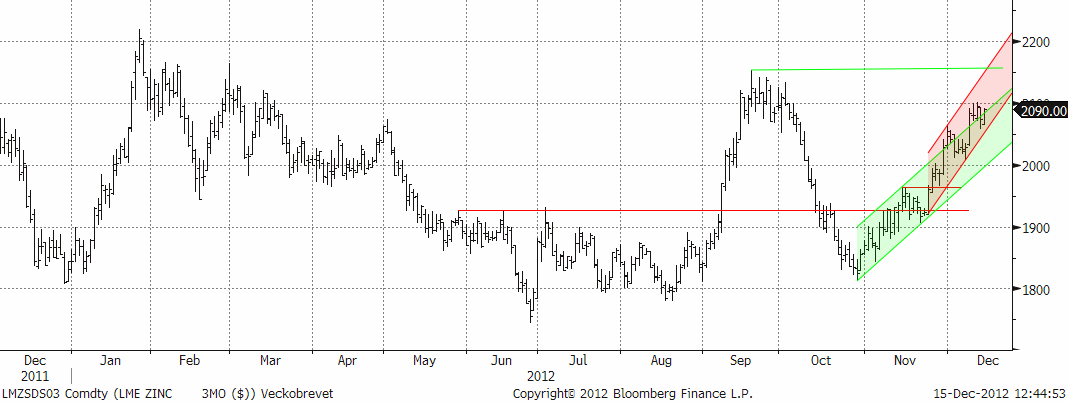 Den förväntat starka utvecklingen infriades i veckan med en prisuppgång med 2,8 % för 3-månaders LME. Som vi skrivit tidigare är de största användningsområdena för zink bygg- och transportindustrin. Två områden som nu gynnas av en mer positivt syn på tillväxten i Kina och USA. Zink ligger väl placerad i det scenariot. De kommande årens begränsningar av utbudet talar också för en starkare zinkmarknad. Hotet är, som vi också nämnt tidigare, kortsiktigt överskott p.g.a. ökad gruvproduktion i Kina. Enligt bedömare avtar tillväxten nu av det kinesiska utbudet. Zinkpriset är fortfarande lågt ur ett produktionskostnadsperspektiv. Överskottet har också byggt stora lager som måste betas av. Ett troligt scenario är samma utveckling som för aluminium, d.v.s. att lagret knyts upp i finansieringsupplägg (se tidigare beskrivningar kring aluminiummarknaden) som kommer att undanhålla material från konsumenter, vilket framför allt gynnar de fysiska premierna, men också sannolikt zinkpriset. Omsvängningen av stämningsläget gör att vi nu bedömer att marknaden kommer diskontera starkare fundamental balans, vilket ofta innebär att investerare köper i ”förtid”.