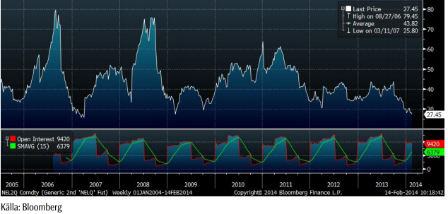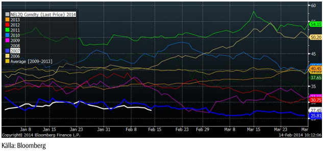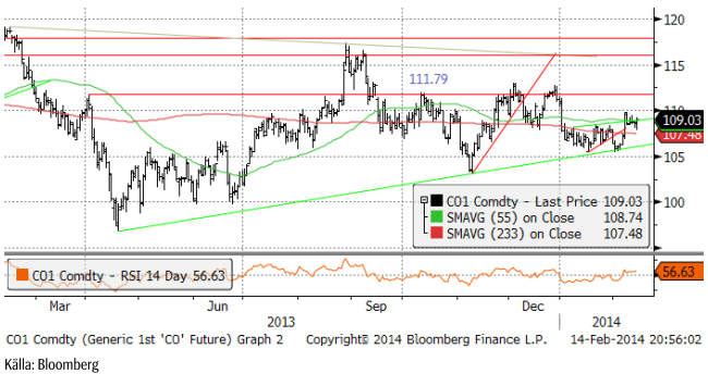 Fundamentalt genomgår oljemarknaden ett paradigmskifte där fracking radikalt ökar utbudet av råolja och minskar OPEC:s monopolställning. På längre sikt är det svårt att se något annat än ett stort prisfall på olja och vi vill handla oljemarknaden från den korta sidan. Tekniskt och i det mycket korta perspektivet av en vecka är det dock inte uteslutet, rentav troligt, att priset bryter upp och testar den övre delen av det ”gamla” prisintervallet. Med den reservationen behåller vi säljrekommendation, men rekommenderar inte att man går in i nya korta positioner på den här nivån, utan avvaktar bättre säljtillfällen.