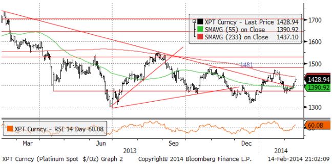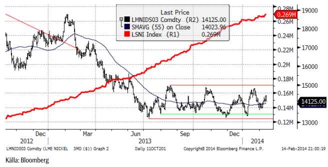 Konsumenter har varit på köpsidan. De tar tillvara varje prisnedgång för att köpa ytterligare hedgar. Sammantaget har detta tagit tillbaka priset till den ”gamla” tekniska stödnivån vid ca 1750 dollar. Premierna i den amerikanska marknaden har planat ut vid de extrema nivåer kring 440 dollar per ton. Enligt våra källor i den fysiska marknaden skeppas nu aluminium från Mellanöstern till USA för att dra fördel av de höga premierna. CME har startat ett nytt terminskontrakt på den fysiska premien och det visar redan snabbt ökande öppen balans. LME planerar fortfarande att introducera ett kontrakt. De nya LME-reglerna för lagerhanteringen kommer på lite längre sikt att dämpa premierna. En annan effekt av den höga premien är att finansieringsaffärer inte rullas framåt, när contangot mellan cash + premium till termin (utan premium) på LME inte ger tillräckligt avans. Risken för högre räntor i och med att FED har inlett tapering och att klockan tickar för nästa räntehöjningscykel påverkar sannolikt också.