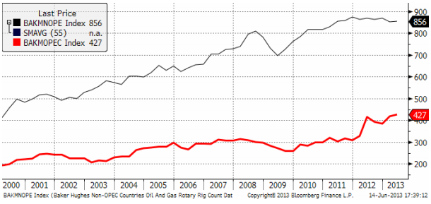 Det är intressant att notera att antalet borriggar utanför OPEC har legat stabilt mellan 800 och 900 sedan 2010. Antalet borriggar i oljerika OPEC har däremot ökat från 250 till 427 under samma tid. Prognosen är att OPEC:s reservkapacitet ska öka betydligt de kommande åren, även om produktionen just nu är mindre än tidigare, t ex i Libyen, som producerar mindre än 1 miljon fat om dagen. Innan Kadaffi-regimen föll producerade landet 1.7 miljoner fat om dagen.