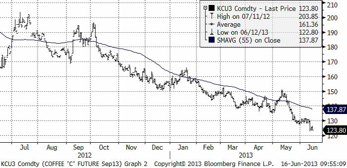 Kaffepriset tog ett steg ner för en vecka sedan och har sedan hållit sig stabilt. Priset börjar närma sig bottennivåer, men vi avvaktar till dess vi ser tecken på att trenden har vänt. Brasilianska kaffebönder rapporteras ha det allt värre, där många gör förluster på dagens priser.