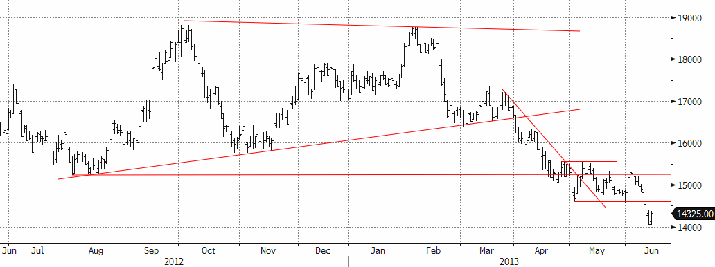 Effekten av RKEF-tekniken riskerar att flytta ner nivån där utbudsminskningarna verkligen får effekt. Priset har brutit viktiga stödnivåer, och vi får gå tillbaka till juli 2009 för att hitta lägre priser. I det perspektivet kommer nästa stora stödnivå in kring $14000. I veckan nådde vi nästa dit (14055 som lägst). Nivåerna är mycket attraktiva på 6-12 månaders sikt. I det perspektivet är Nickel S (utan hävstång) att föredra.