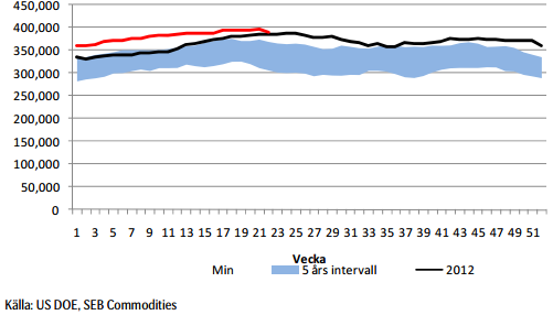 Nedan ser vi amerikanska råoljelager enligt DOE i tusen fat. Den svarta kurvan är 2012 års lagernivåer vecka för vecka och den lilla röda linjen är 2013 års nivå.