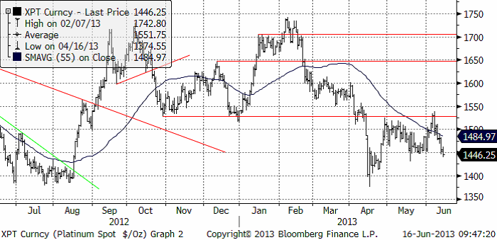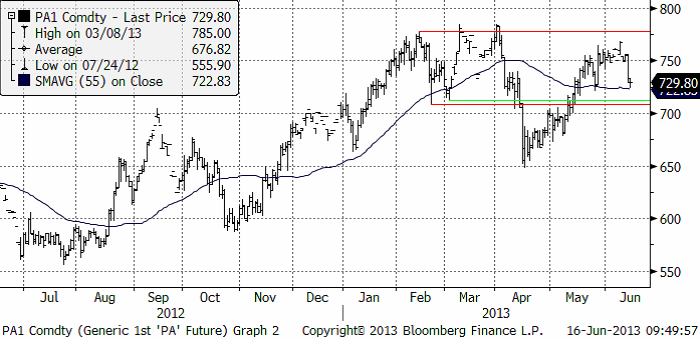 Palladium föll kraftigt i torsdags. Prisfallet hejdades på samma nivå som prisfallet i slutet av maj bottnade på. Uppenbarligen finns det köpare som tycker att den nivån är svår att motstå. Uppgången från botten i april slutade lägre än toppnoteringarna i mars och april, vilket är ett svaghetstecken. Palladium ligger på en mycket högre nivå än de andra ädelmetallerna, om man tittar på historiska relationer. Trots att prisfallet kortsiktigt har hejdats, är den lite längre trenden försvagad. Jag tror att vi får se ”sidledes” rörelse den närmaste tiden, och då blir rekommendationen att inta neutral position. Vi går alltså ur BEAR PALLAD X4 S.